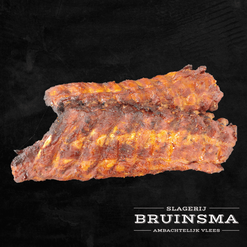 Onze smaakvolle spareribs worden langzaam gegaard, waardoor het vlees heerlijk mals wordt en zichzelf overgeeft aan de subtiele rookaroma's die elk hapje doordringen. De zorgvuldig uitgekozen kruiden en specerijen vormen een harmonieus samenspel met de rijke BBQ-glazuur, die een perfecte balans tussen zoet en hartig creëert.